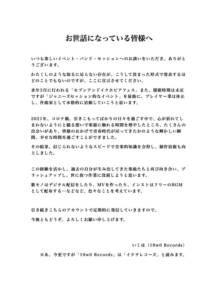来年3月に行われる「セブンアンドイクホピアフェス」また、開催時期は未定ですが「ジャニーズセッション的なイベント」を最後に、プレイヤー業は休止し、作曲家として本格的に活動していこうと思います。